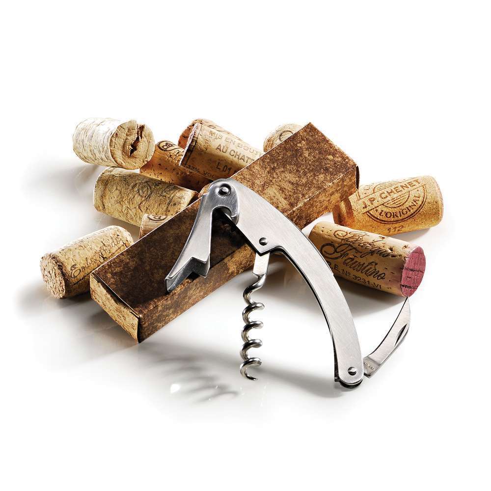 Abridor saca rolhas em Aço Inox escovado Conta com lâmina para cortar lacre, abridor de garrafa e saca rolhas. Dimensões: 11×2,5×1,2cm