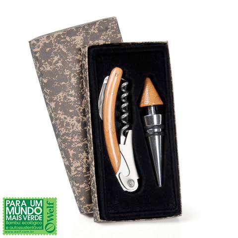 Acessórios para vinho em Metal/Bambu. Conta com tampão e abridor saca-rolhas. Dimensões do saca-rolhas: 11×2,5x1cm Dimensões do tampão: 9,5x2cm Produtos confeccionados em Bambu:Utilizamos o Bambu, por ser uma matéria prima ecológica, autossustentável e com alta resistência. Além de versátil, o Bambu é 30% mais leve que as madeiras de lei. Sua utilização não agride o meio ambiente, pois, quando ceifado rebrota em pouco tempo.