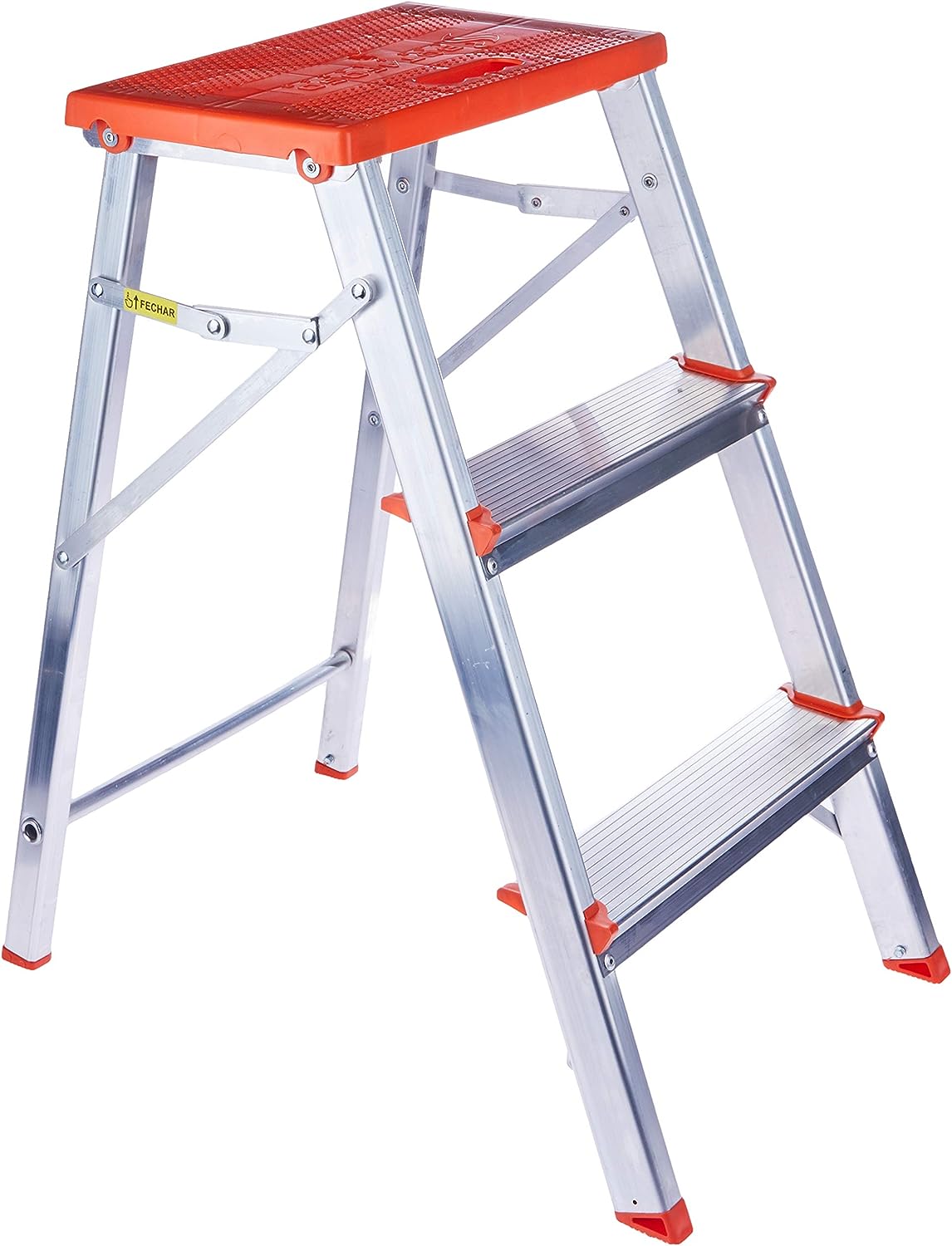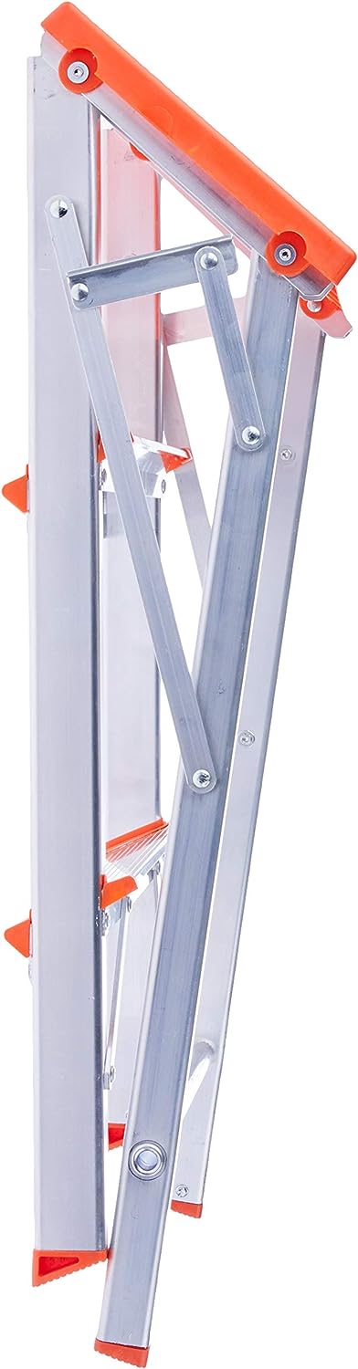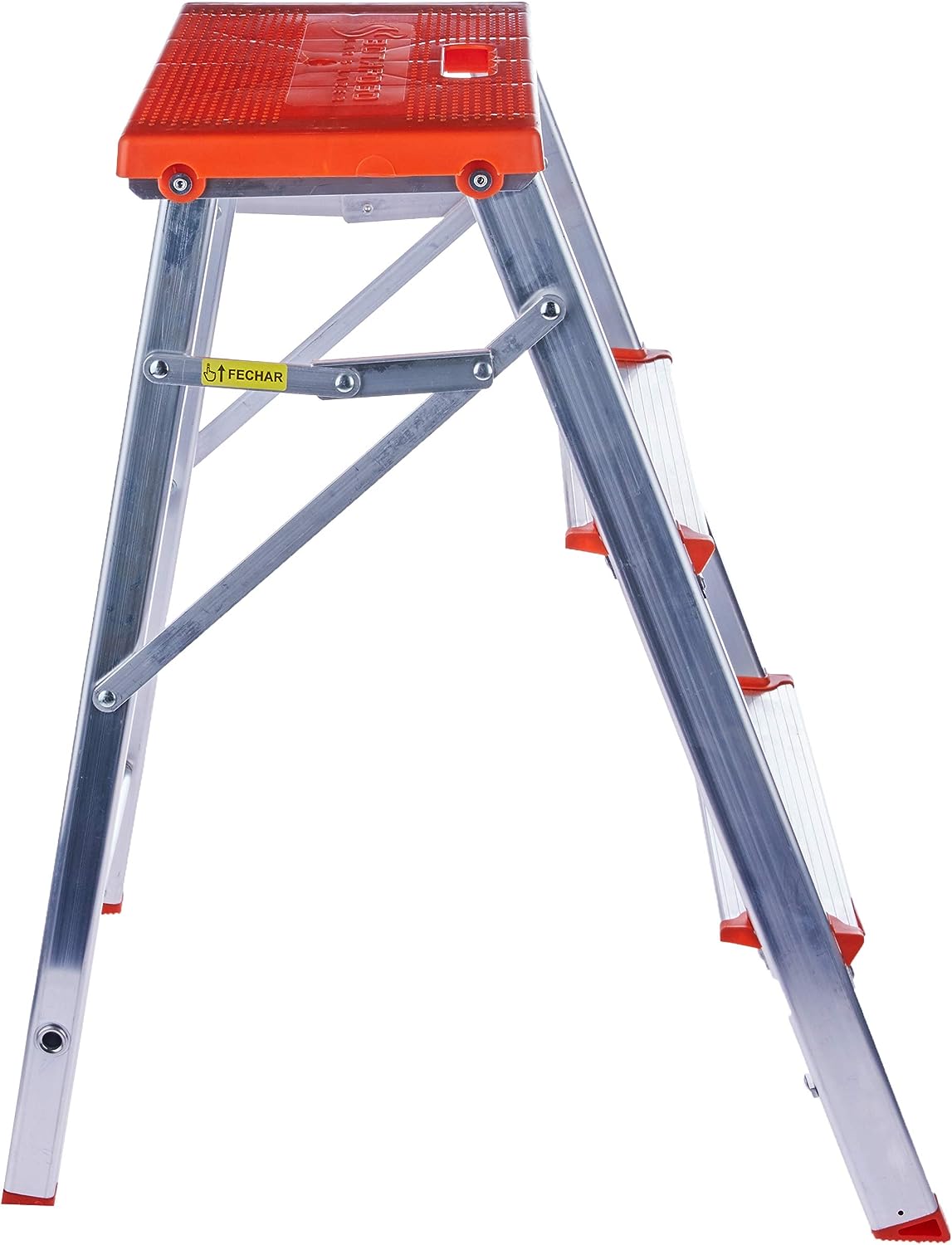 Escada em alumínio para uso doméstico. Com apenas 10 cm quando dobrada é bem fácil de guardar. Seu patamar de polipropileno de alta resistência e segurança para o trabalho diário.