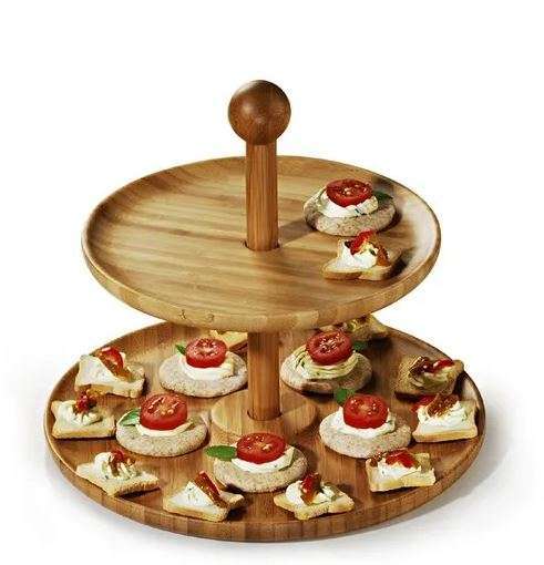 Bandeja dupla ideal para servir canapés e salgadinhos. Produzida em Bambu ela é resistente, leve, moderna e prática. O bambu é um material ecológico e autossustentável que possui um bactericida natural em suas fibras. Lavar com água e detergente neutro usando uma esponja. Secar imediatamente após a lavagem. Não deixar de molho na água (submerso) e não lavar em máquina de lavar louça. Guardar as peças de bambu em lugar arejado e sem umidade. Dimensões: Altura: 6cm – Largura: 26cm – Comprimento: 26cm. Produto Natural: Sujeito a variação de tonalidade