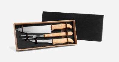 Conjunto de Faca em Bambu/Aço Inox. Acompanha faca 8”,faca 5″ para desossar e garfo em Bambu/Inox. Rebites em Aço Inox 304, umdos mais resistentes à ferrugem e corrosão. Produtos confeccionados em Bambu:Utilizamos o Bambu, por ser uma matéria prima ecológica, autossustentável e comalta resistência. Além de versátil, o Bambu é 30% mais leve que as madeiras delei. Sua utilização não agride o meio ambiente, pois, quando ceifado rebrota empouco tempo. Como cortesia, na faca 8″ fazemos uma gravação com os cortesdo boi.