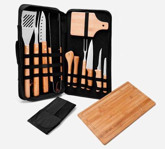 Conjunto para Churrasco e Caipirinha em Bambu/Aço Inoxcom estojo e avental. Acompanha estojo em Tecido preto com alça de mão, aventalcom bolso e regulagem de altura em Brim preto, tábua para Churrasco e tábua paraCaipirinha em Bambu, pegador em Bambu, socador em Bambu, faca 7”, faca 5″para desossar, faca 4″ para frutas e garfo em Bambu/Inox. Conta comutensílios para Churrasco como faca, garfo, espátula e pegador em Bambu/Inox. Atábua para Churrasco é confeccionada com tripla camada invertida, para darmaior durabilidade e não deformar com o passar do tempo. Rebites em Aço Inox304, um dos mais resistentes à ferrugem e corrosão.