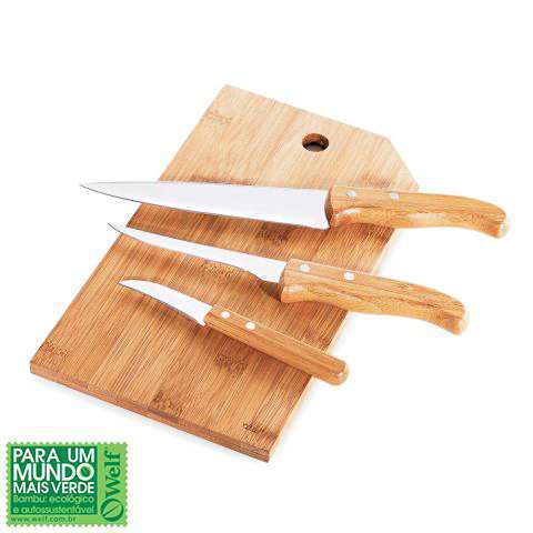 Conjunto para Cozinha em Bambu/Aço Inox. Acompanha tábua em Bambu com furo, faca 7”, faca 5″ para desossar e faca 3″ para legumes em Bambu/Inox. Tábua confeccionada com tripla camada invertida, para dar maior durabilidade e não deformar com o passar do tempo. Rebites em Aço Inox 304, um dos mais resistentes à ferrugem e corrosão. Dimensões da tábua: 32×20,5×1,5cm Produtos confeccionados em Bambu:Utilizamos o Bambu, por ser uma matéria prima ecológica, autossustentável e com alta resistência. Além de versátil, o Bambu é 30% mais leve que as madeiras de lei. Sua utilização não agride o meio ambiente, pois, quando ceifado rebrota em pouco tempo.