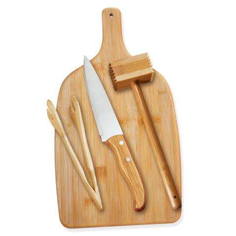 Conjunto para Churrasco/Cozinha em Bambu/Aço Inox. Acompanha tábua, pegador 22cm e martelo em Bambu; faca 7” em Bambu/Inox. Tábua confeccionada com tripla camada invertida, para dar maior durabilidade e não deformar com o passar do tempo. Rebites em Aço Inox 304, um dos mais resistentes à ferrugem e corrosão. Dimensões da tábua: 39,5×21,5×1,5cm Produtos confeccionados em Bambu:Utilizamos o Bambu, por ser uma matéria prima ecológica, autossustentável e com alta resistência. Além de versátil, o Bambu é 30% mais leve que as madeiras de lei. Sua utilização não agride o meio ambiente, pois, quando ceifado rebrota em pouco tempo.
