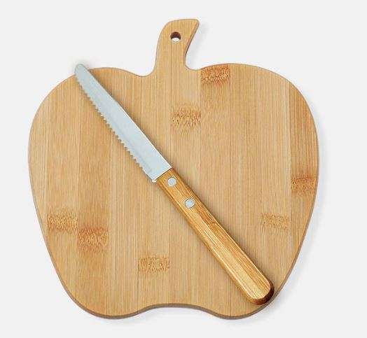 Conjunto para frutas em Bambu/Aço Inox. Conta com tábuaem formato de maçã em Bambu e faca para frutas 4″. Tábua confeccionada comtripla camada invertida, para dar maior durabilidade e não deformar com opassar do tempo. Produtos confeccionados em Bambu: Utilizamos o Bambu, por seruma matéria prima ecológica, autossustentável e com alta resistência. Além deversátil, o Bambu é 30% mais leve que as madeiras de lei. Sua utilização nãoagride o meio ambiente, pois, quando ceifado rebrota em pouco tempo.