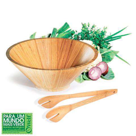 Conjunto para Salada em Bambu.Acompanha tigela e pegador em Bambu.Capacidade da tigela: 3LProdutos confeccionados em Bambu: Utilizamos o Bambu, por ser uma matéria prima ecológica, autossustentável e com alta resistência. Além de versátil, o Bambu é 30% mais leve que as madeiras de lei. Sua utilização não agride o meio ambiente, pois, quando ceifado rebrota em pouco tempo.