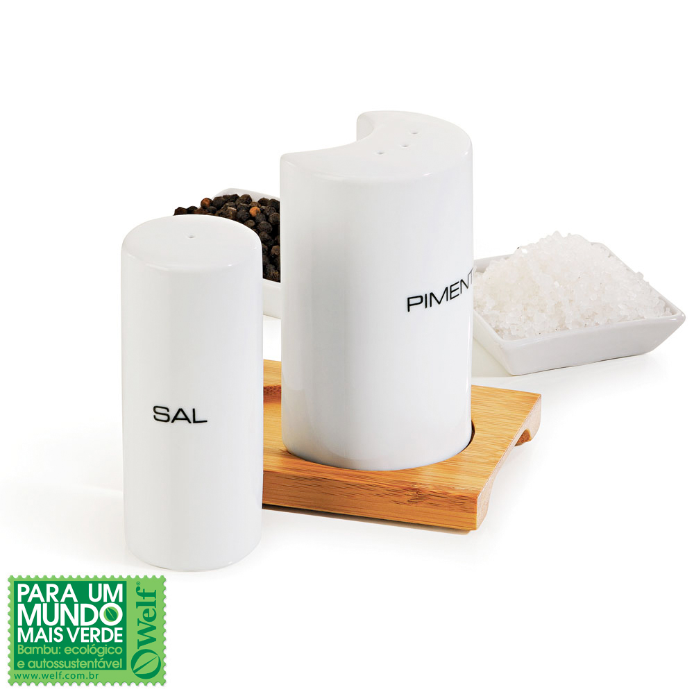 Conjunto para Sal e Pimenta em Porcelana com base em Bambu. Produtos confeccionados em Bambu:Utilizamos o Bambu, por ser uma matéria prima ecológica, autossustentável e com alta resistência. Além de versátil, o Bambu é 30% mais leve que as madeiras de lei. Sua utilização não agride o meio ambiente, pois, quando ceifado rebrota em pouco tempo.