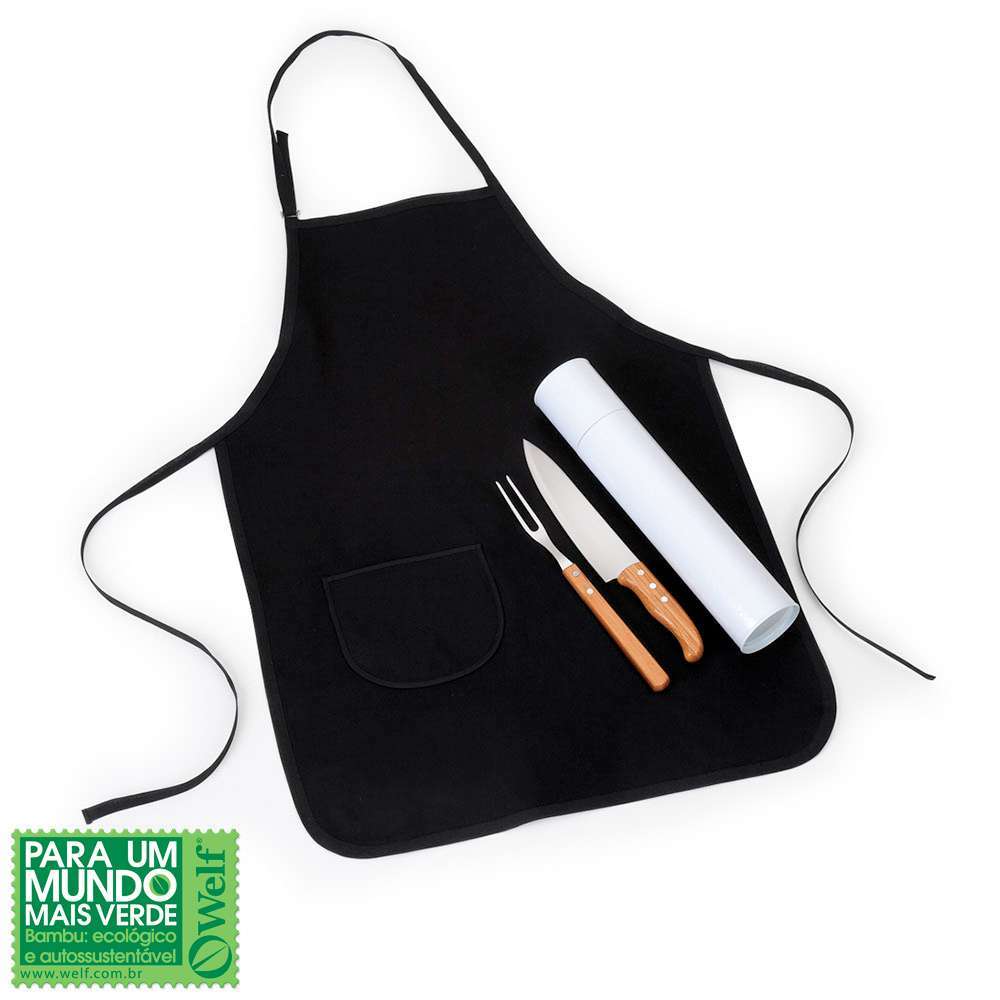 Conjunto de Faca e Garfo em Bambu/Aço Inox com tubo e avental. Acompanha tubo branco, avental com bolso e regulagem de altura em Brim preto, faca 8” e garfo em Bambu/Inox. Rebites em Aço Inox 304, um dos mais resistentes à ferrugem e corrosão. Dimensões do avental aberto: 79×54,5cm Produtos confeccionados em Bambu:Utilizamos o Bambu, por ser uma matéria prima ecológica, autossustentável e com alta resistência. Além de versátil, o Bambu é 30% mais leve que as madeiras de lei. Sua utilização não agride o meio ambiente, pois, quando ceifado rebrota em pouco tempo.