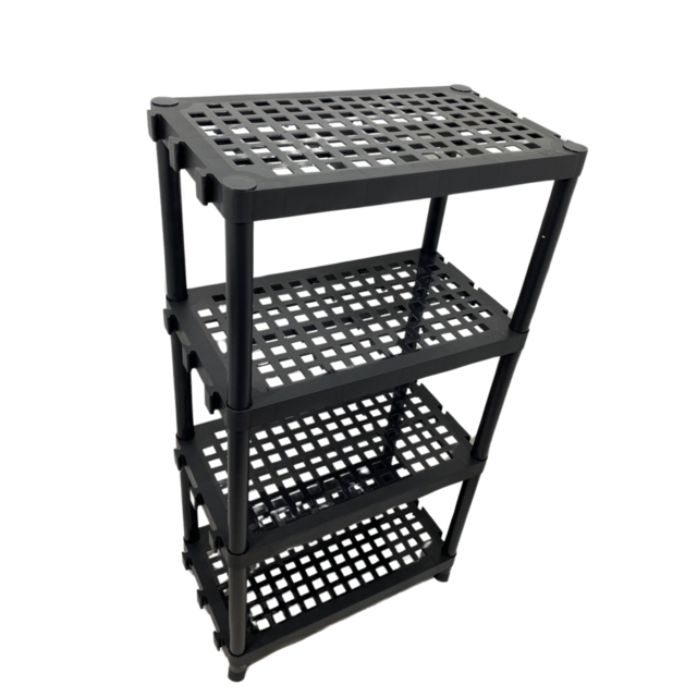 Possui encaixes laterais que permitem montar e adaptar a estrutura conforme a necessidade, trazendo mais flexibilidade na organização. Está disponível nas versões com 3 ou 4 prateleiras, oferecendo mais espaço para acomodar objetos com praticidade e manter o ambiente sempre organizado.