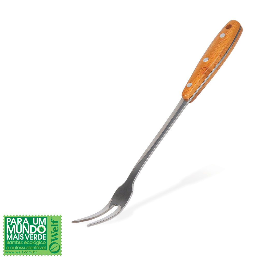 Garfo em Aço Inox com cabo em Bambu. Produtos confeccionados em Bambu:Utilizamos o Bambu, por ser uma matéria prima ecológica, autossustentável e com alta resistência. Além de versátil, o Bambu é 30% mais leve que as madeiras de lei. Sua utilização não agride o meio ambiente, pois, quando ceifado rebrota em pouco tempo. Sem gravação.