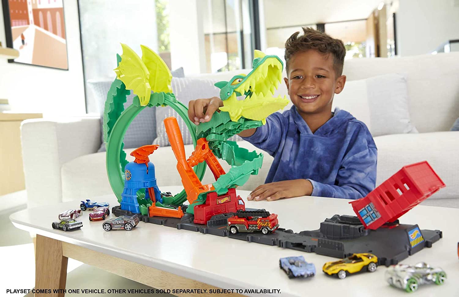 Cuidado! Um perverso dragão chamado Dante está atacando o quartel de bombeiros de Hot Wheels City! Dante “ganha vida” e abate o quartel de bombeiros, onde ele devora qualquer carro que passe em seu caminho. O carro voa por seu corpo, onde as crianças usarão suas melhores habilidades acrobáticas para lançá los para a cabeça do dragão para abatê lo. Este conjunto oferece uma brincadeira modular em 360 graus e se conecta a outros conjuntos e pistas Hot Wheels City para estender as possíveis narrativas. Inclui um carro Hot Wheels . As cores e as decorações podem variar.