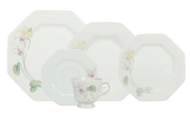 Aparelho de jantar no modelo sextavado, modernizando as peças florais. Elgante e ao mesmo tempo clean, é uma otima pedida para sua mesa posta!