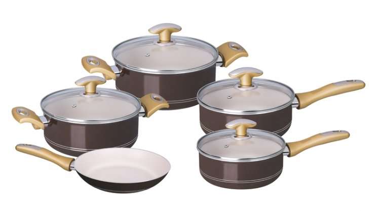 Conteúdo:1 Frigideira Ø 22 cm1 Caçarola Ø 20 cm1 Caçarola Ø 22 cm1 Panela Ø 18 cm1 Panela Ø 20 cm1. Revestimento interno em antiaderente Starflon T3 e externo silicone.2. Devido ao revestimento antiaderente os alimentos não grudam, proporcionando facilidade na limpeza.3. Maior espessura do revestimento dos produtos para proporcionar melhor cozimento dos alimentos e maior economia pois o calor se espalha de forma uniforme e rápida. 4. Proporcionam um cozimento rápido e uniforme.5. Cabos, alças e pegadores de baquelite antitérmico com revestimento soft-touch e detalhes de aço inox. 6. Tampas de vidro com saída de vapor, que permitem visualizar os alimentos durante o cozimento.7. Design moderno e diferenciado.8. Podem ser utilizadas em fogão a gás e elétrico. 9. Podem ir à máquina de lavar louças.10. Seguindo as instruções de uso, permanecerão bonitas por muito mais tempo.Uso seguro e adequado:Para garantir a durabilidade do revestimento dos produtos, recomenda-se usar utensílios de nylon, silicone ou madeira. Secá-los bem após a lavagem, mesmo sendo em máquina de lavar louças.