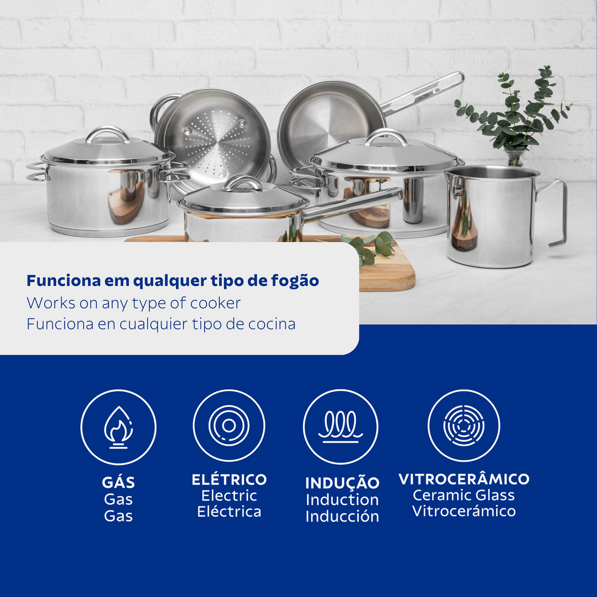 Esse conjunto de panelas antiaderente é totalmente feitas em aço inox, por isso não solta nenhum resíduo nos alimentos, mantendo-os saudáveis. É um jogo de panelas altamente durável, mantém suas características originais, preservando a beleza e a higiene e a durabilidade do material. Tem fundo triplo (panela aço inox + alumínio + aço inox) e distribui o calor uniformemente, proporcionando um cozimento mais rápido e uniforme, economizando energia e deixando os alimentos aquecidos por mais tempo. Essas panelas Tramontina de fundo triplo podem ir ao forno para gratinar ou finalizar pratos, na temperatura máxima de 260°C, e possuem tampas com saída de vapor e encaixe perfeito. Elas também podem ser lavadas diariamente na máquina de lavar louças. Compre online o seu jogo de panelas Tramontina
