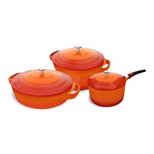 Essencial para a sua cozinha, aspanelas Le Cook são perfeitas para fazer cozidos e assados, como tambémversáteis para assar pães e bolos. São livres de elementos nocivos como o PFOAe PTFE (compostos químicos dos antiaderentes convencionais). Além disso, requero uso de menos óleo pelo alto poder antiaderente, tornando o alimento maissaudável para toda família. Não é só uma panela: é um sonho em sua cozinha.Panela em alumínio com Revestimento Antiaderente Cerâmico PARTE EXTERNA:alumínio de alta densidade (metal com melhor condução térmica e de rápidaindução).PARTE INTERNA: Revestimento antiaderente Cerâmico para melhorretenção do calor e cozimento uniforme dos alimentos.Kit composto por:3 PEÇAS:LC1801 – Panela Le Cook com cabo destacável (18cm – 2L) – 1unidade;LC1803 – Caçarola Le Cook com pegadores de silicone (24cm –4,5L) – 1 unidade;LC1806 – Frigideira Le Cook com tampa e pegadores de silicone(24cm – 2,4L) – 1 unidade;ESPECIFICAÇÕESMaterial: Alumínio com Revestimento Interno CerâmicoMedidas do Produto – dimensões aproximadas: Peso (Kg) 4,281(CxLxA): 35 x 35 x 15 cmMarca: Le CookFabricante: Marcamix – Utilidades GourmetRECOMENDAÇÕESSempre deixe a panela esfriar antes de mergulhá-la na água.Se deixar queimar os alimentos, deixe a panela de molho emágua durante algum tempo antes de lavá-la.Utilize somente detergente neutro e esponja macia para fazera limpeza.Depois da lavagem, sempre que possível, enxágue a panela comágua quente e seque-a imediatamente para que mantenha o brilho original.O cloro da água morna e o detergente podem deixar manchas napanela.Durante o uso mantenha fora do alcance de crianças. Paramaior segurança, mantenha o cabo sempre voltado para parte interna do fogão enunca deixe o produto sem supervisão.PRAZO DE GARANTIAA Linha de panelas da Le Cook possui garantia de 2 anos.Importante: A garantia é limitada apenas para defeitos de fabricação.A mesma não abrange desgaste natural do produto ou usoindevido do mesmo, bem como trincas provocadas por quedas e riscos deutensílios metálicos.INSTRUÇÕES DE USORemova eventuais etiquetas e lave a panela antes deutilizá-la pela primeira vez.Na sequência, unte a superfície com óleo e aqueça-a, em fogobaixo por 2 a 3 minutos, e reserve.Após esfriar lave-a com esponja macia e detergente neutro emágua morna. Enxágue bem e seque completamente.Para preservar o Revestimento antiaderente Cerâmico nãoutilize utensílios com pontas metálicas.Recomendamos usar apenas utensílios de nylon, madeira ouSilicone.Sempre use fogo baixo ou médio quando cozinhar alimentos,isso ajuda a preservar seus nutrientes e também a conservar a superfície doRevestimento antiaderente Cerâmico.Recomendamos o uso de pouco óleo para o cozimento dealimentos.