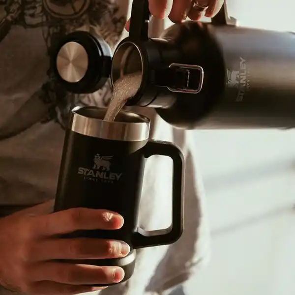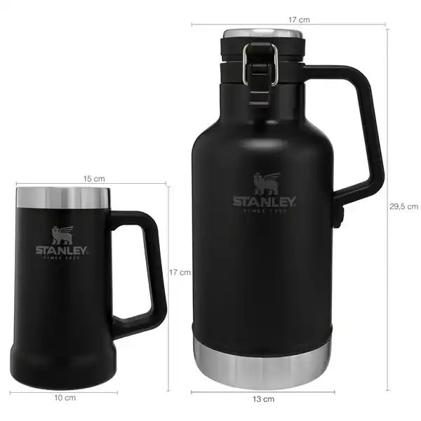 nKit 2 canecas cerveja stanley 709ml e garrafa térmica growler 1,9l preto matte. #canecas térmicas de cerveja chopp #garrafa growler térmico classic #linha bar stanley garantia: vitalícia / peso: 1,90kg / cores: preto e inox / ref: 8035e8040x2 dimensões da garrafa: 17cm (c) x 13cm (l) x 29,5cm (a) dimensões das canecas: 15cm (c) x 10cm (l) x 17cm (a) capacidade: garrafa: 1,9 litros; canecas: 709ml. eficiência térmica: garrafa: – quente: 18 horas; – gelado: 24 horas; – com gelo: 96 horas. canecas: – quente: 1 hora; – gelado: 5 horas; – com gelo: 20 horas. cuidados e limpeza: – não coloque na garrafa gelo seco, refrigerantes ou líquidos que possam gerar alta pressão; – lavar com água e sabão neutro utilizando esponja macia, seguido de pano seco; – podem ir a máquina lava-louças; – evitar batidas. conteúdo: – 02 canecas térmicas de cerveja 709ml matte black; – 01 growler térmico classic 1,9l matte black. detalhes do produto: – possuem parede dupla em aço inox com isolamento a vácuo que garante temperatura e qualidade, sem que fiquem quentes ou suados na parede externa; – extremamente higiênicos, são de fácil limpeza e, seu material em inox alimentício impede a aderência de qualquer substância; – a garrafa possui tampa com sistema de fechamento por clipe e bucal com ampla abertura; – livres de bpa. materiais: – polipropileno (pp); – aço inox 18/8. saboreie sua cerveja gelada em qualquer lugar com o combo growler térmico 1,9 litros e canecas térmicas 709ml classic da stanley. Resistente, durável e atemporal com seu preto matte clássico, este conjunto de uma garrafa térmica e duas canecas de chopp stanley além de ótima preservação térmica, possui parede dupla com isolamento a vácuo que permite manter sua cerveja na temperatura ideal por muito mais tempo.