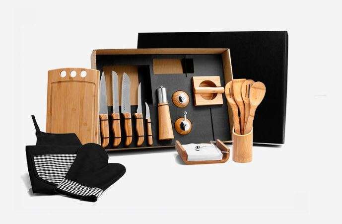 Kit Gourmet. Conta com tábua, 4 utensílios com suporte,amassador de tempero, porta guardanapo em Bambu; faca 7″, faca para pão,faca Santoku 7″, faca para desossar, faca para legumes, moedor e conjuntopara sal e pimenta em Bambu/Inox; avental e luva térmica em Brim. Estãoperfeitamente acomodados em uma caixa para presentear. Produtos confeccionadosem Bambu: Utilizamos o Bambu, por ser uma matéria prima ecológica,autossustentável e com alta resistência. Além de versátil, o Bambu é 30% maisleve que as madeiras de lei. Sua utilização não agride o meio ambiente, pois,quando ceifado rebrota em pouco tempo.
