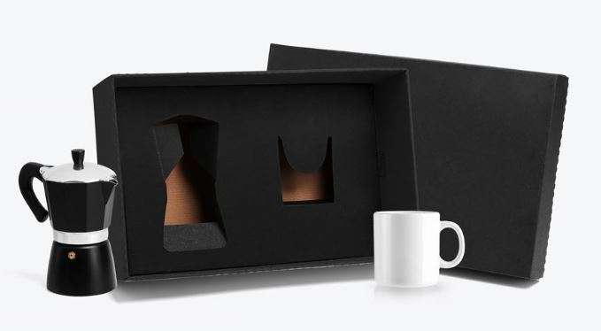 Kit para café contendo uma cafeteira italiana em alumínioe uma caneca em cerâmica.