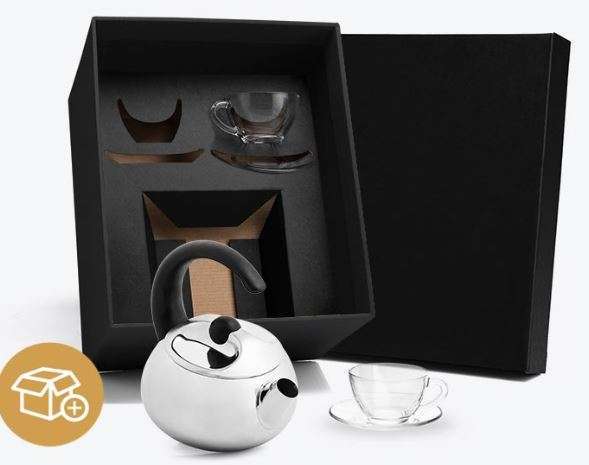 Kit para café ou chá contendo chaleira em Inox e duasxícaras com pires em Vidro.