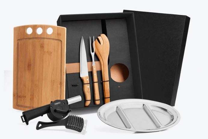 Kit para churrasco. Conta com tábua e pegador 30cm emBambu; faca 7” e garfo em Inox / Bambu; travessa tripla em Inox; soprador eescova para churrasqueira. Produtos confeccionados em Bambu: Utilizamos oBambu, por ser uma matéria prima ecológica, autossustentável e com altaresistência.