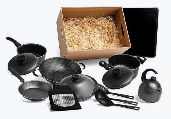 Kit para cozinha Conta com 2 caçarolas com tampa, panelawok, frigideira e chaleira em Inox antiaderente; espátula, colher e concha emNylon; avental em Brim.
