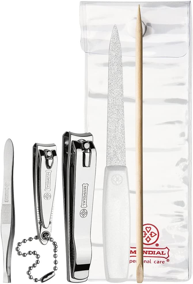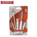 O kit para cuidado de beleza da Mundial é essencial para viagens e para ser levado na bolsa. Possui 1 cortador de unhas para mãos, 1 cortador de unha para pés, 1 lixa de meta, 1 palito de madeira, 1 pinça e 1 nécessaire. Instruções de uso: Para utilizar a Pinça, posicione-a o mais próximo possível da raiz do pelo e retire-o com firmeza na direção de seu crescimento. Para utilizar o Cortador de Unha, pressione a alavanca e repita o movimento, deslocando o cortador por toda a extensão da unha, até adquirir a forma desejada. Utilize o Palito para retirar o excesso de esmaltes dos cantos das unhas, envolvendo a ponta em algodão umedecido em removedor de esmalte. Utiliza a Lixa para dar forma ou reduzir o comprimento das unhas, para formato arredondado lixe-as na diagonal e para formato quadrado faças movimentos firmes e retos. Para melhor conservação do seu conjunto evite quedas, mantenha-o seco e lubrificado, faça a higienização dos produtos com água e sabão e lembre-se que estes produtos são de uso pessoal.
