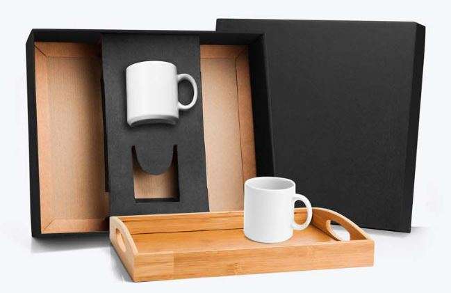 Kit para Servir Conta com bandeja em Bambu e duas canecasem cerâmica (270ml cada). Estão perfeitamente acomodados em uma caixa parapresentear.