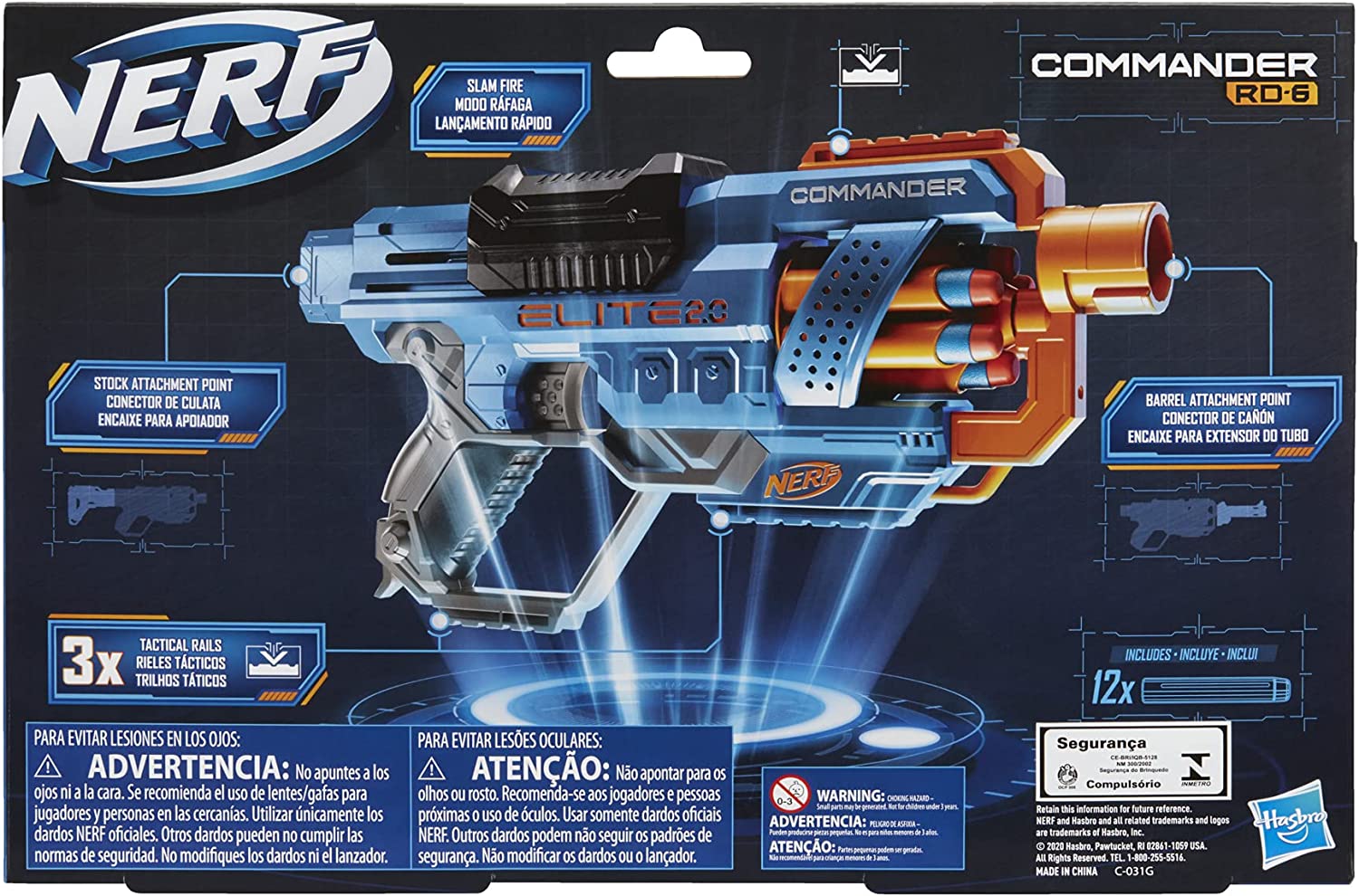 A aventura sobe de nível com os lançadores Nerf Elite 2.0, que apresentam recursos de personalização integrados para que se possa utilizar acessórios e sair na frente na aventura Nerf. É hora de montar seu próprio lançador Elite 2.0 para otimizar sua estratégia de jogo e trazer desempenho tático e flexibilidade a todas as aventuras! O lançador Nerf Elite 2.0 Commander RD-6 possui 3 trilhos táticos, encaixe para tubo frontal e encaixe para apoio para personalizar o lançador nas aventuras Nerf. O lançador possui um tambor giratório para 6 dardos, sendo possível lançar um dardo por vez ou em sequência rápida. Tubo frontal e apoio não incluídos. Inclui 12 dardos oficiais Nerf – o suficiente para carregar completamente o tambor e 6 dardos para se manter nas proximidades para recargas. Óculos recomendados (não incluídos). Não requer pilhas. Nerf e todas as propriedades relacionadas são marcas registradas da Hasbro.