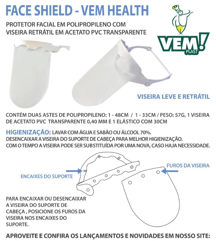 Protetor Facial com Viseira Retrátil em Polipropileno e Acetato PVC – Face Shield Vem HealthFACE SHIELD – VEM HEALTHProtetor Facial em Polipropileno com viseira em Acetato PVC Transparente- Viseira leve e retrátilHIGIENIZAÇÃOLavar com água e sabão ou Alcool 70%Desencaixar a viseira do suporte de cabeça para melhor higienização.Com o tempo, a viseira pode ser substituida por uma nova, em caso de necessidade.Para encaixar ou desencaixar a viseira do suporte de cabeça, posicione os furos da viseira nos encaixes do suporte.CONTEÚDO DA EMBALAGEM- 2 astes em polipropilendo, sendo uma de 48cm e outra de 33cm- 1 viseira em Acetato de PVC transparente 0,40mm- 1 elástico com 30cm