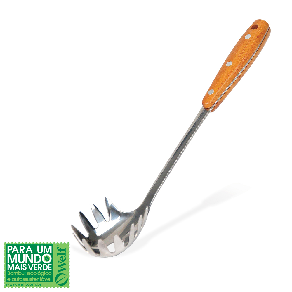 Pegador para macarrão em Aço Inox com cabo em Bambu. Produtos confeccionados em Bambu:Utilizamos o Bambu, por ser uma matéria prima ecológica, autossustentável e com alta resistência. Além de versátil, o Bambu é 30% mais leve que as madeiras de lei. Sua utilização não agride o meio ambiente, pois, quando ceifado rebrota em pouco tempo. Sem gravação.