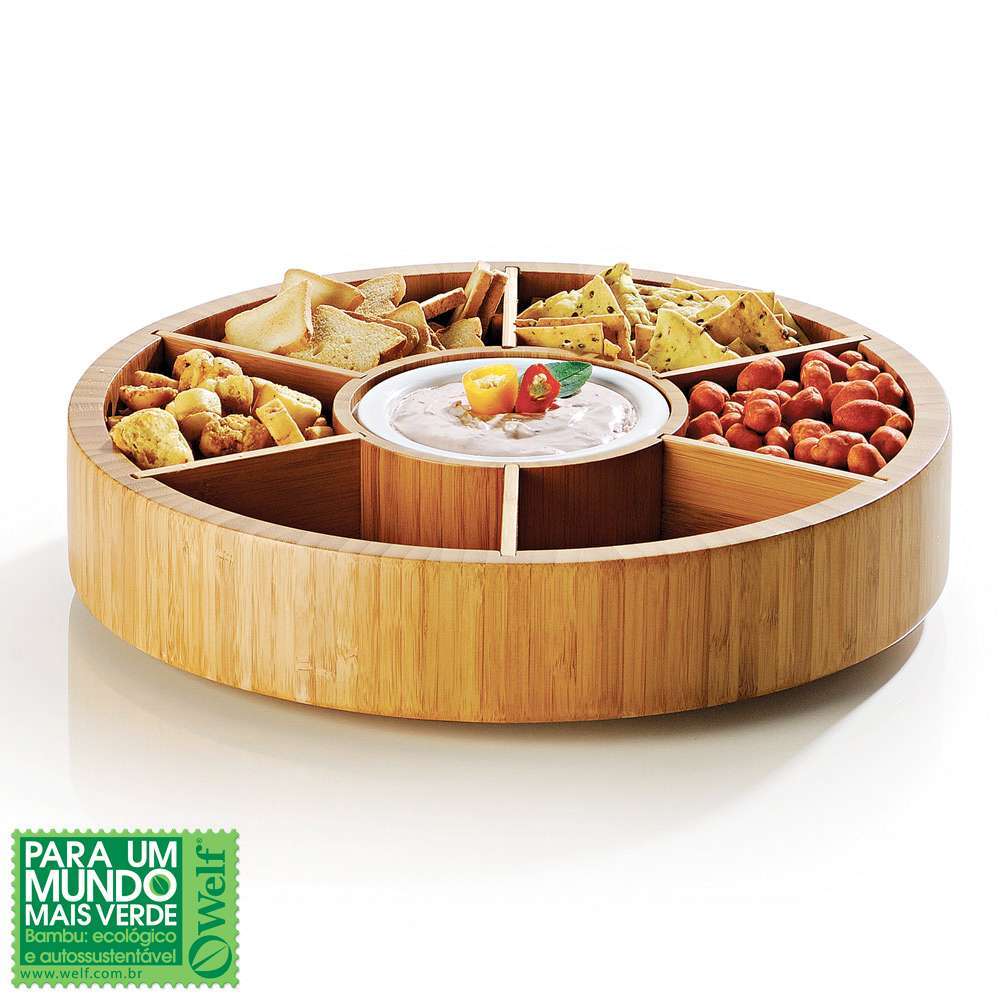 Petisqueira giratória em Bambu e cumbuca em Cerâmica. Possui 6 divisões. Dimensões: 30,5x7cm Produtos confeccionados em Bambu:Utilizamos o Bambu, por ser uma matéria prima ecológica, autossustentável e com alta resistência. Além de versátil, o Bambu é 30% mais leve que as madeiras de lei. Sua utilização não agride o meio ambiente, pois, quando ceifado rebrota em pouco tempo.