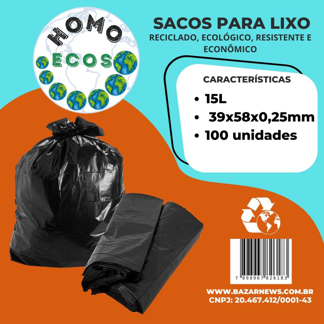 A nossa linha de sacos para lixo da HOMO ECOS foi desenvolvido pensando em transformar o nosso planeta Terra em um ambiente mais limpo, livrando a natureza do resíduos descartados pelo Homem! Toda cadeia de produção com produtos reciclados, recolhidos nas ruas, movimentando economia e gerando renda para pessoas de baixa renda.- 15 litros- 100 unidades- 39 X 58 X 0,02 Produto resistente e de boa qualidade que não agride ao MEIO AMBIENTE!