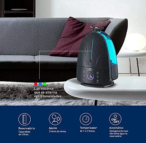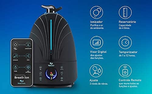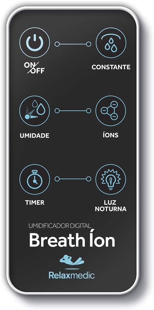 Tenha Alta Tecnologia com o Umidificador de Ar Breath íon da Relaxmedic. Sua Função Ionizadora Permite Um Ar Ainda Mais Saudável, através do controle remoto você pode ajustar todas as funções. São 3 Níveis de Ajuste de Saída de Névoa, Temporizador de 1 a 12 Horas, Para Desligamento Automático, Painel com Visor Digital e Acionamento Touch. Controle o Seu Ambiente como o Indicador de Umidade, a Programação do Nível de Umidade do Ambiente de 45% a 90%. Alta Capacidade de Umidificação com Reservatório de 3,5 Litros de água e 12 Horas de Uso Contínuo (na Saída Máxima de Névoa), luz Noturna Especial Para Usar o Umidificador a Noite, Modo Seguro com Desligamento Automático quando reservatório está Vazio e com Aviso Sonoro. ”