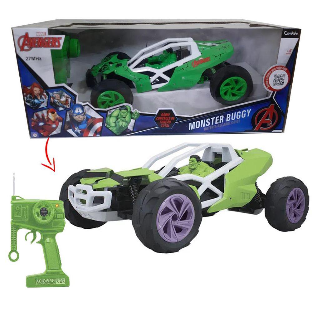 Veiculo do Hulk com rádio controle de 27mHz e bateria recarregável. Utiliza 1 bateria 9V para o controle não inclusa apenas para demonstração.