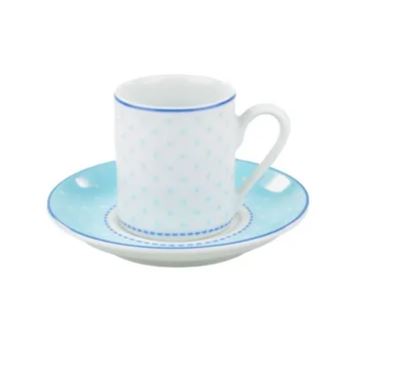 Um poá branco com um tom alegre de azul é o que faz da decoração Maitê descontraida e especial. Se adapta muito bem à diversas ocasiões e combinações, dará mais leveza e alegria à sua mesa posta. As xícaras para café são em um formato reto, com muita elegância para o seu momento do cafézinho!